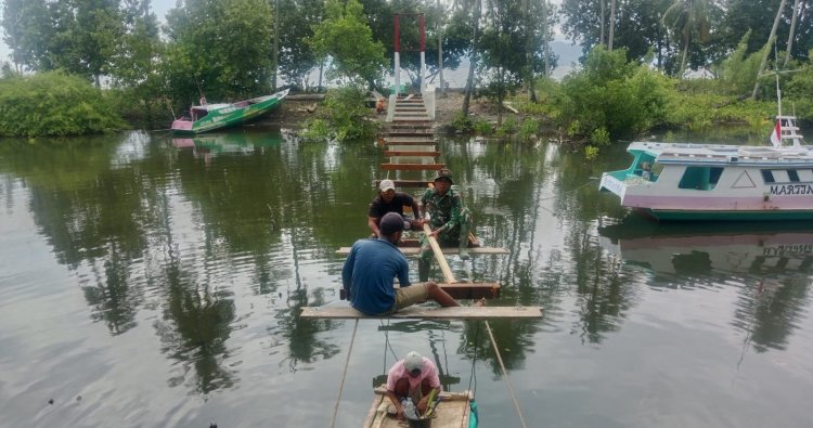 Di tengah keterbatasan alat dan medan yang cukup sulit, personel Kodim 1401/Majene tampak bekerja di atas permukaan air dengan bertumpu pada rangka kayu sederhana. Mereka memasang material jembatan secara hati-hati sambil menjaga keseimbangan, demi mempercepat penyelesaian akses penghubung yang sangat dibutuhkan warga.